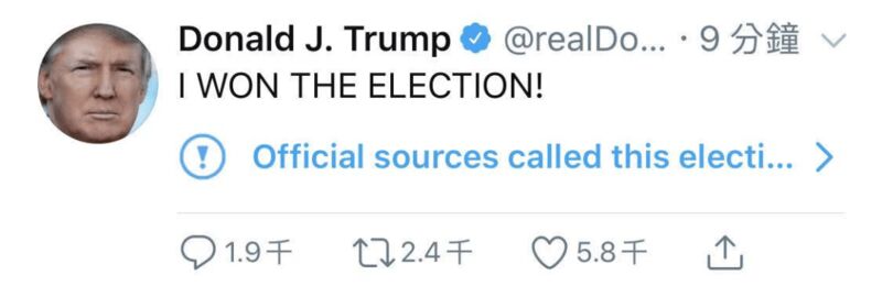 而在此前(接近美东时间16日凌晨0时),特朗普也曾发推称“我赢了大选”。不过随后,他的这条推文被推特官方贴上标签“与官方消息源对这场选举判定的结果不同”。