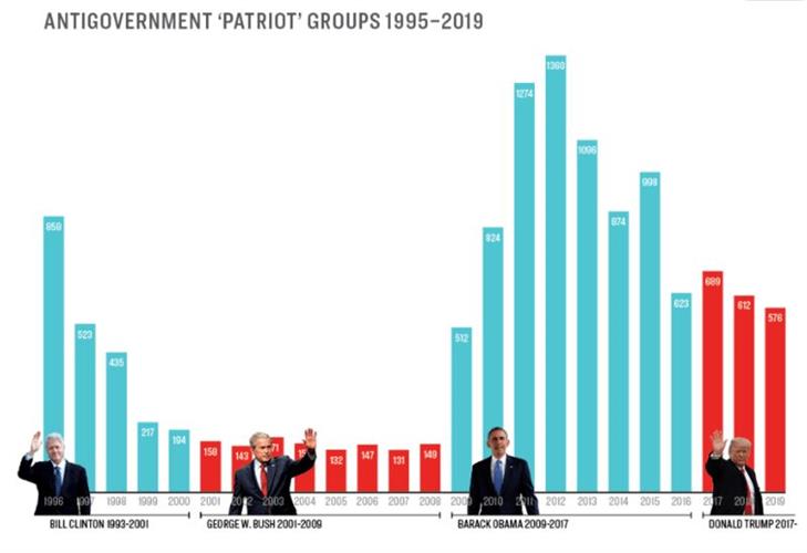 美国社会极右翼民兵组织的数量变化有一个很明显的规律,如下图:民主党上台就不断增多,共和党主政则下降,而且从80年代到今天,无论涨跌,绝对体量都在不断攀升。