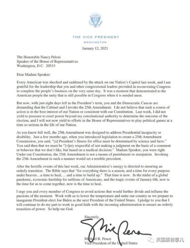 过去几天,包括众议院议长佩洛西在内的政府高层都向彭斯施压,要求他立即启用修正案。但彭斯在昨天给佩洛西回信,拒绝了这个提议。“我不认为这样的做法符合我们国家的最大利益,或者符合宪法。……正如你们所知,第25条修正案设计出来是在总统出现身体疾病时使用的,它不是一个惩罚的工具。如果现在使用这个程序,可能会开启一个可怕的先例。”“国会应当做的,是避免进一步分裂国家和煽动激情。我们现在应该团结一致,让各方冷静,确保乔·拜登成为下一任总统。”