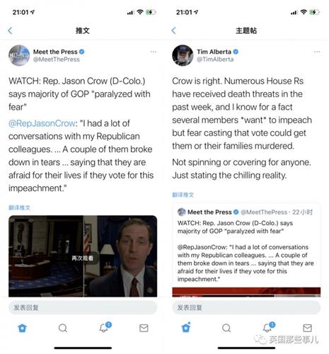 民主党议员杰森·克劳(Jason Crow)告诉媒体,他的很多共和党朋友因为透露出支持弹劾的想法,已经收到死亡威胁。“很多人落泪了,他们担心自己如果支持弹劾,会被谋杀。”《政治》杂志的记者蒂姆·阿尔伯塔(Tim Alberta)也给出同样的信息,好几个共和党议员想投支持票,但真的不敢。