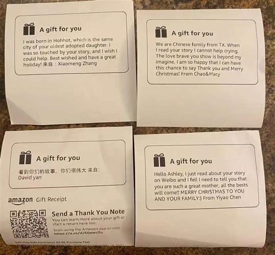 圣诞节将至,他们没钱更换破损的家庭用品,只能委婉地告诉孩子们,也许圣诞老人会送来礼物,但父母仍在为困窘的现实而发愁。直到一天,有一位领养妈妈联系Mandi,说有一群中国女士想为像她这样的家庭送上祝福,还让她列出心愿单。Mandi抱着试一试的心态列了一个清单,几小时内,心愿单就被买完了。后来,她将其他领养朋友也拉了进来,就这样,加入爱心活动的美国家庭越来越多。