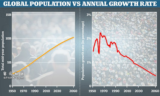 2021 年世界人口将增长 7800 万至 78 亿,符合预测(左)——但增长率降至 0.9%,这意味着自 1960 年代以来一直在下降(右)
