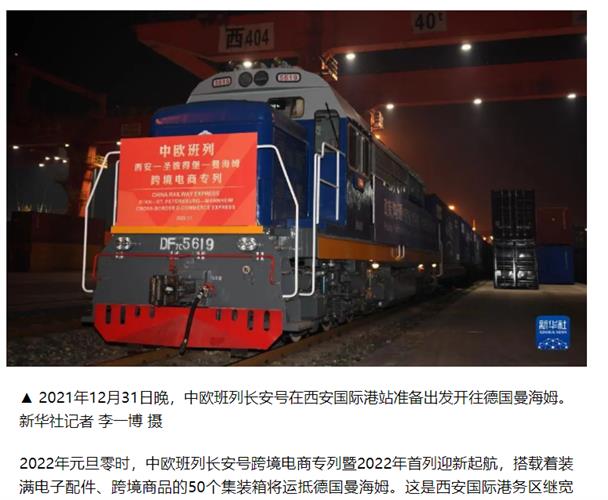 二零二二,元旦零点,古都西安。一列满载50个集装箱的中欧班列长安号跨境电商专列,从西安出发驶向圣彼得堡。这些集装箱,将在圣彼得堡换渡轮到德国的穆克兰港,再继续由铁路最终运抵德国曼海姆。这趟行程总里程约12808公里,全程运输时长大概在16天至18天之间。