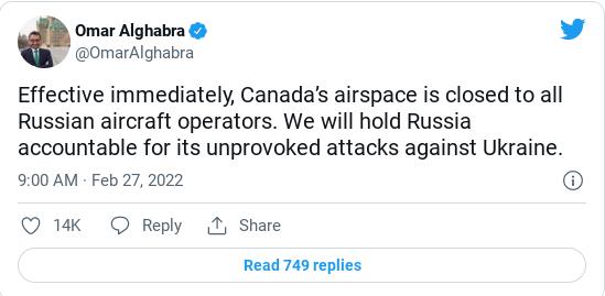 加拿大联邦交通部长在2月27日宣布,加拿大领空将对所有俄罗斯航空公司的飞机关闭,立即生效。“我们将以此作为对俄罗斯突然袭击乌克兰的制裁,” 他在推文中表示。