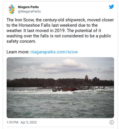 该公园将沉船的状况通过视频记录下来,并发布在Twitter上。“Iron Scow这艘有百年历史的沉船在上周末因天气原因,进一步移向马蹄瀑布。上一次移位发生在2019年。它落入瀑布不会给公众安全造成威胁。”