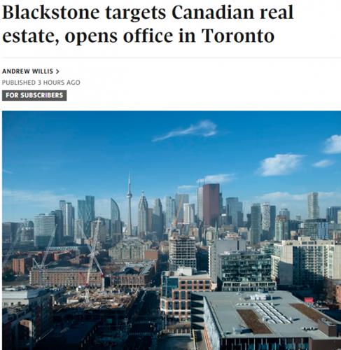全球最大地产投资公司黑石集团(Blackstone Inc.,又称百仕通集团)正在加拿大扩大房地产业务,并在多伦多开设了一个办事处。目前,该公司正从大规模投资于仓库,向商业和住宅地产等新领域扩张。