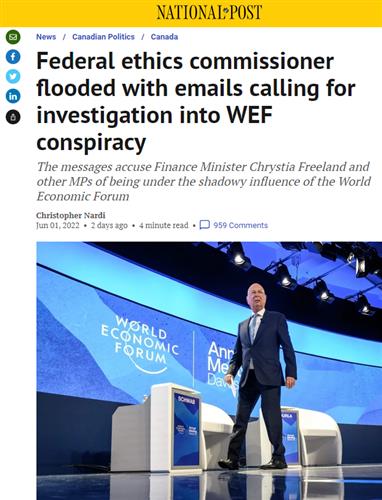 近日,国家邮报的一篇报道指出,今年早些时候,联邦道德专员办公室收到了超过 1,000 封电子邮件、电话、信件甚至传真,人们要求它调查一个阴谋论,声称一些议员和财政部长方慧兰 (Chrystia Freeland)受惠于世界经济论坛(World Economic Forum,简称WEF)。