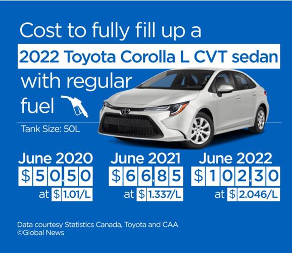 Toyota Corolla L CVT sedan也是最常见的一款车。用同样的公式计算,加满一箱50升油要花$102.30元,去年同期是$66.85元,2020年同期是$50.50元。