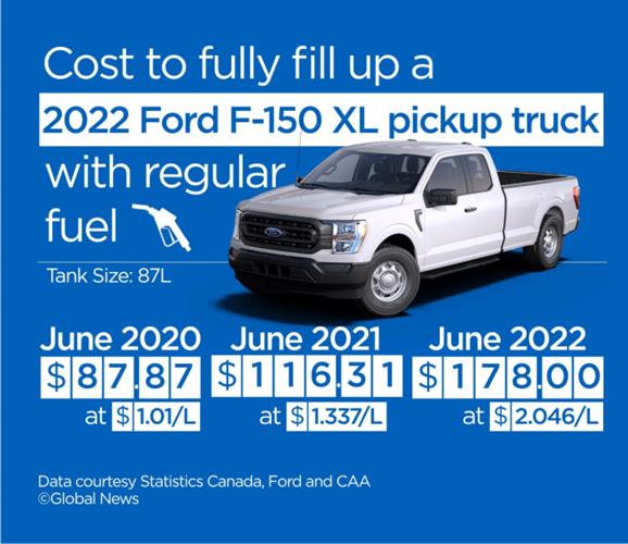 皮卡车里最常见的Ford F-150 XLl车的油箱是87升。加满一箱油现在要$178元。去年同期是$116.31元。2020年同期是$87.87元。