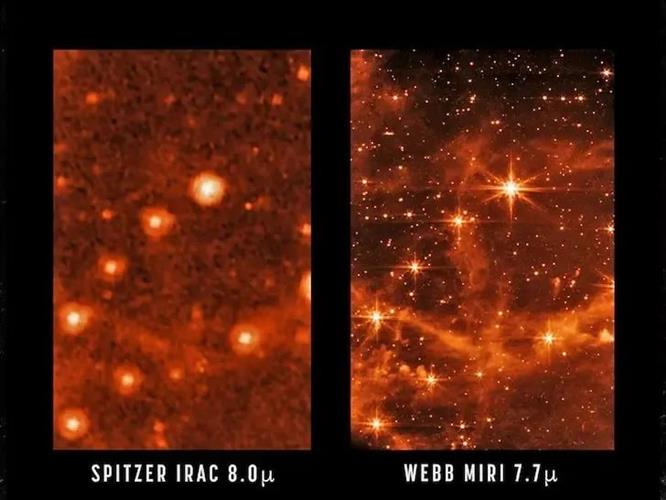 斯皮策太空望远镜(左)和詹姆斯韦伯太空望远镜(右)捕捉到的清晰度和细节水平。 NASA/ESA/CSA/STScI