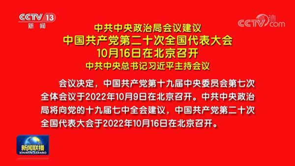 会议决定,中国共产党第十九届中央委员会第七次全体会议于2022年10月9日在北京召开。中共中央政治局将向党的十九届七中全会建议,中国共产党第二十次全国代表大会于2022年10月16日在北京召开。