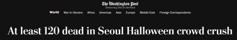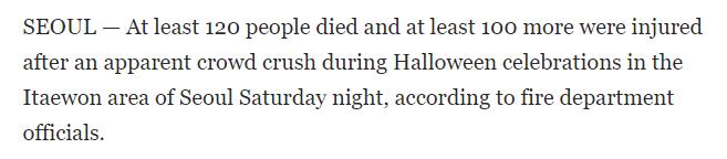 新闻来源:每日邮报根据韩国消防局的一名官员表示,韩国当地时间周六晚上,在首尔梨泰院休闲区(Itaewon leisure district of Seoul)发生的致命踩踏事件,数十万人聚集在首尔参加2022年的万圣节。