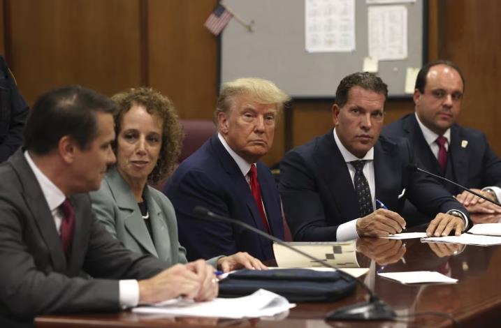 穿着深蓝色西装打着红色领带的特朗普是第一位面临刑事指控的在任美国总统或前美国总统,他双手合十坐在辩护席上,在律师的陪同下进行辩护。