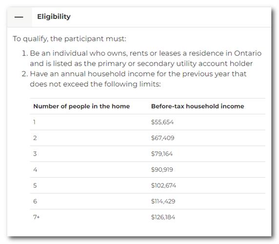 居住在安省的人(包括那些生活在电网连接的原住民社区的人),作为房主或租房者负责支付他们每月的电费的人,都有资格参加这个项目。提供的支持类型将取决于上一年的家庭收入水平和家住了多少人,或者是否获得了合格的政府或能源支持福利。社会住房的居民也有资格。