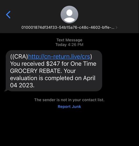 Global News 收到了伪装成杂货退税的网络钓鱼骗局的照片。人们被要求点击一个文本链接,并被告知:“您收到了 247 元的一次性杂货退税。”