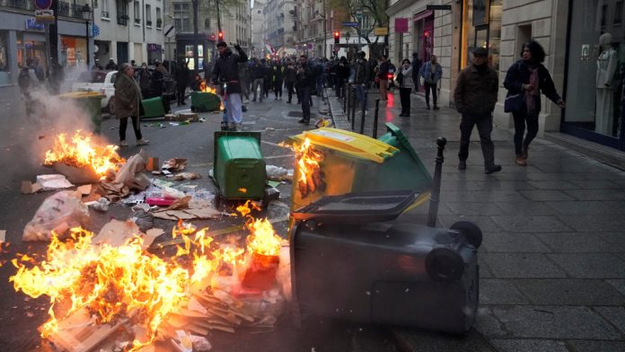 在巴黎,抗议民众聚集在市政厅外,手持写着“愤怒的气氛”和“改革不取消,罢工不止歇”的标语,显示宪法委员会的裁决不太可能平息民众对于马克龙和这项退休改革计划的普遍怒火。一些民众沿着巴黎街头游行,沿路焚烧垃圾桶,高呼抗议群众耳熟能详的口号:“我们在这里,我们在这里,就算马克龙不想要,我们也在这里。”警方指巴黎有至少112人被捕。