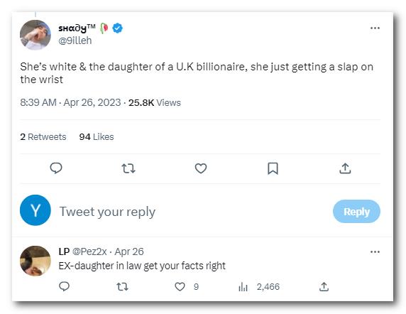 “她是白人,是英国亿万富翁的女儿(底下网友纠正是前儿媳),她只是受到了轻微的惩罚。”