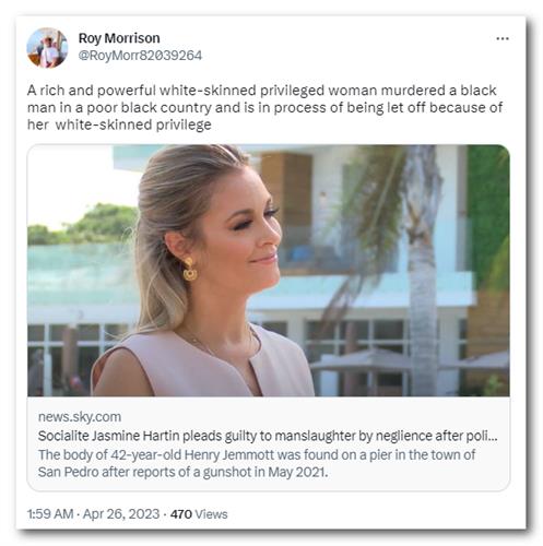 “一个有钱有势的白皮肤特权女性在一个贫穷的黑人国家杀害了一名黑人,并因为她的白皮肤特权而被释放。”