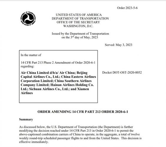 当地时间5月3日,美国交通部发布新令称,允许中国航司每周运营12个往返中美的航班,即刻生效。