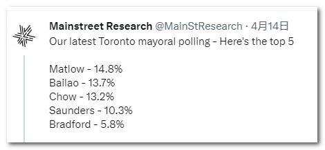 4月14日:Mainstreet Research 公布民调结果显示,市议员Josh Matlow领先。华裔邹至蕙(Olivia Chow)排名第三。
