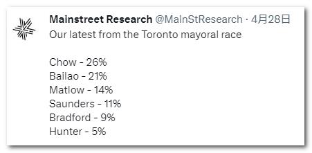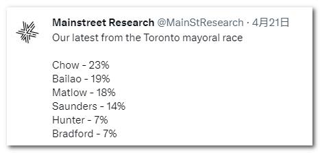 4月21日:民调公司Mainstreet Research 公布的调查显示,在已决定投票意向的选民当中,华裔邹至蕙(Olivia Chow)以 23% 的支持率领先,紧随其后的是前副市长Ana Bailao,支持率为19%。