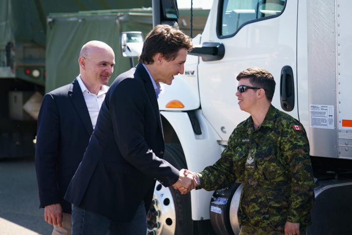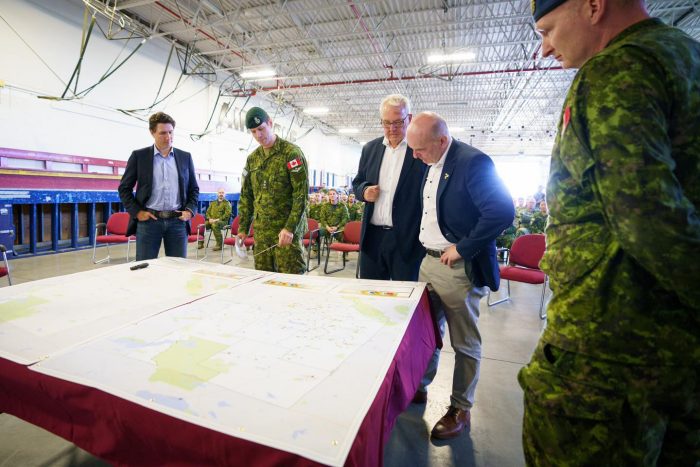 5月15日,加拿大总理特鲁多在联邦应急准备部长布莱尔、爱明顿中区国会议员及旅游部长布瓦索诺的陪同下,探望了前往阿尔伯塔火灾前线救援的加拿大武装部队军人们。