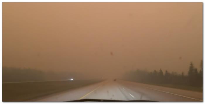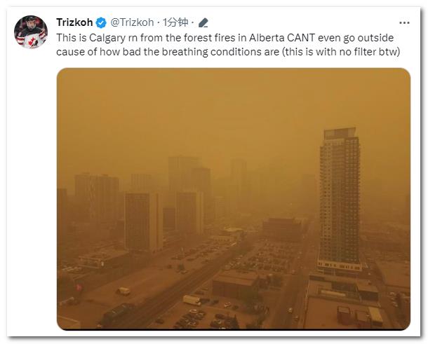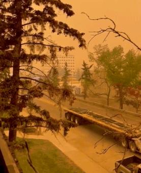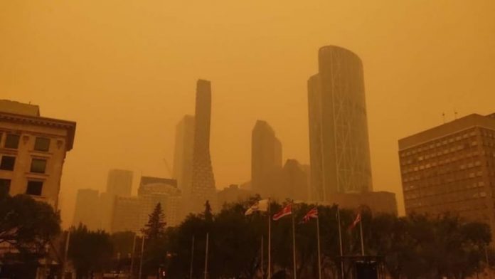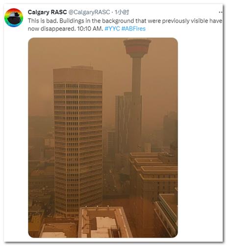 今天(5月16日周二)上午,加拿大西部燃烧的野火产生的烟雾已经降落在阿尔伯塔省南部的部分地区,空气质量警报的范围扩大到卡尔加里市,蓝鸟的天空被诡异的橙色光芒所取代。
