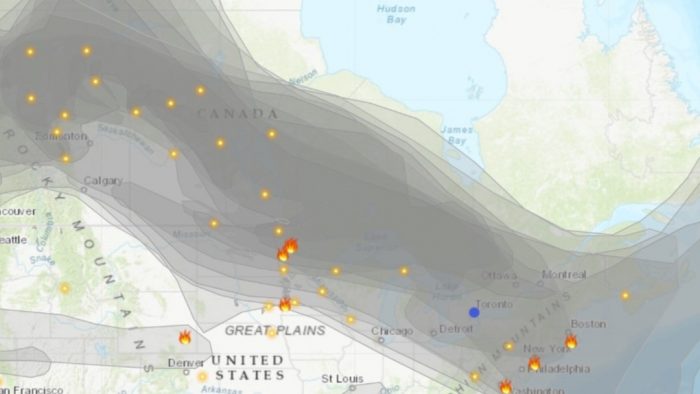 “今天我们可以看到烟雾从西向东穿过五大湖,我们的模型表明今天白天向南,明天应该在五大湖以南。”