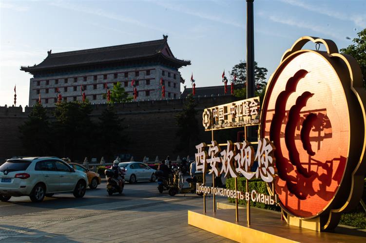 5月16日在西安街头拍摄的中国-中亚峰会主题装置。新华社记者 李京 摄