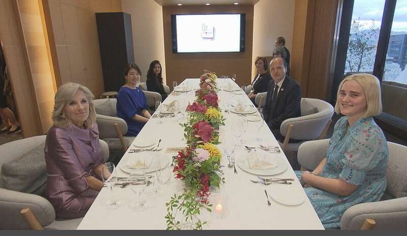 只可惜这一次没法看到吉尔和布里吉特的面对面了,法国第一夫人没有来,吉尔倒是把刚刚大学毕业的孙女梅西·拜登给带到日本了。话说拜登夫妇也挺有趣的,只要一出国,必然会带上孙女。本月初赴英国国王加冕礼时,吉尔也是带着孙女到伦敦的,那一次是芬尼根·拜登。(反正有五个呢,轮流带着呗,也不用她们自己掏旅费。)(