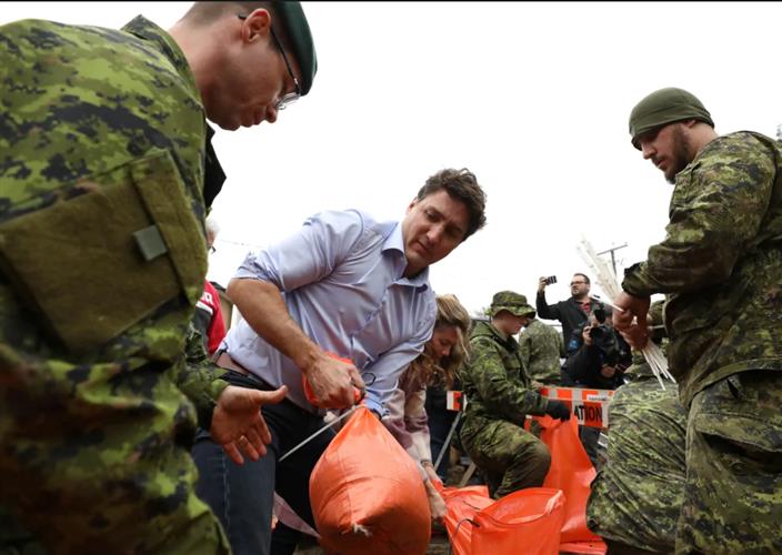 在渥太华河沿岸,居民们、志愿者们、军人们在继续堆沙袋,当地官员说水位可能还没有达到最高峰。