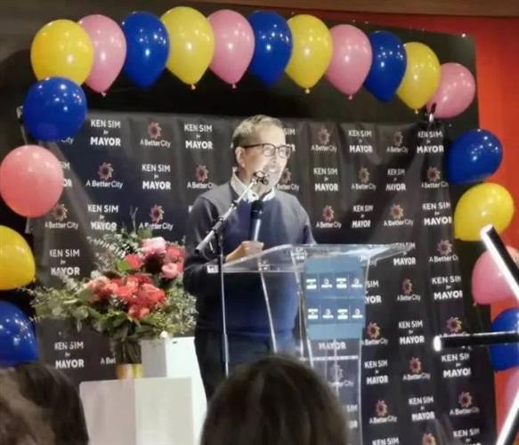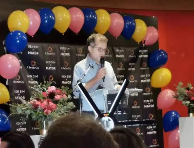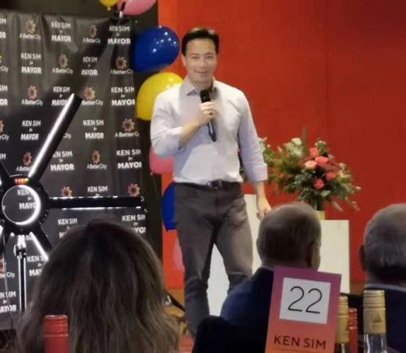 接着,优化城市党的共同主席米尔纳(Stephe Molnar)上台介绍市长候选人沈观健(Ken Sim),然后,他隆重推荐沈观健上台演讲。