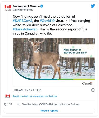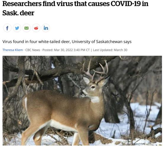 CBC显示,这项调查野生动物的新冠研究小组由由萨斯喀彻温大学、加拿大环境与气候变化、萨斯喀彻温省环境部和加拿大野生动物卫生合作组织的成员组成。去年12月,加拿大环境与气候变化组织表示,他们在萨省的一只野生白尾鹿身上首次发现了新冠病毒。
