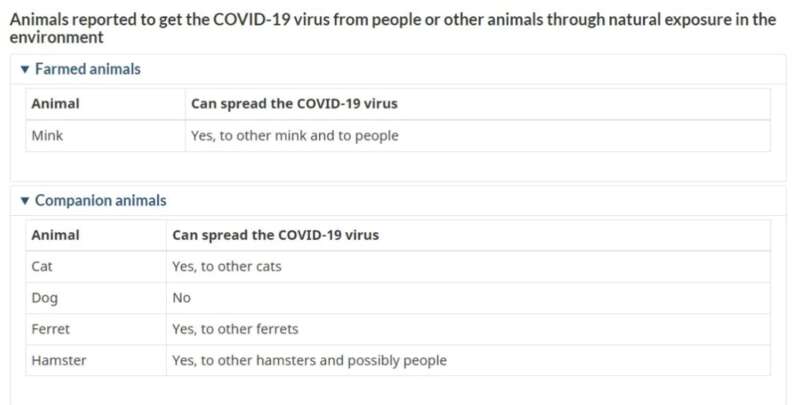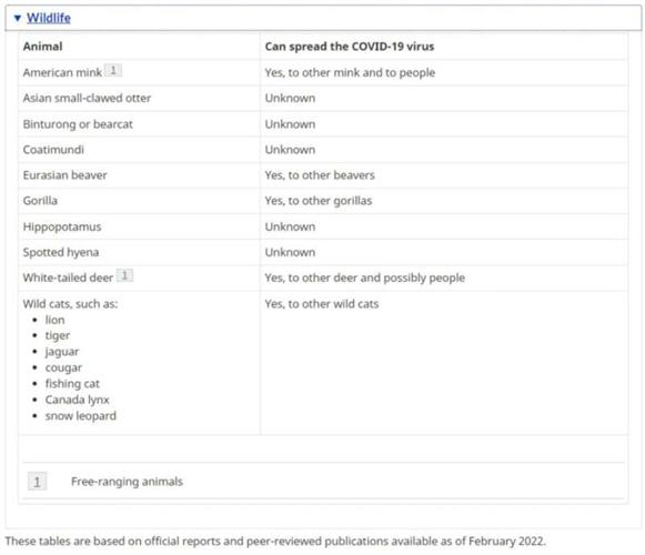 据加拿大政府网站报道,世界上其他动物也有可能通过自然接触从人类或其他动物身上感染新冠病毒。截至2月28日,加国政府的动物感染名单中强调水貂和白尾鹿可以将病毒肆意传播给人类和其他动物;而名单上的其他动物目前只会在族群之间进行新冠病毒传播。