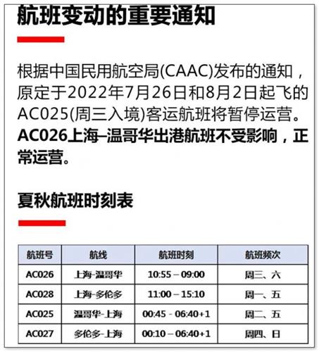 加航今天发布的航班变动的重要通知说明,AC025(周三入境)温哥华-上海暂停两班,但AC026上海-温哥华出港航班不受影响。