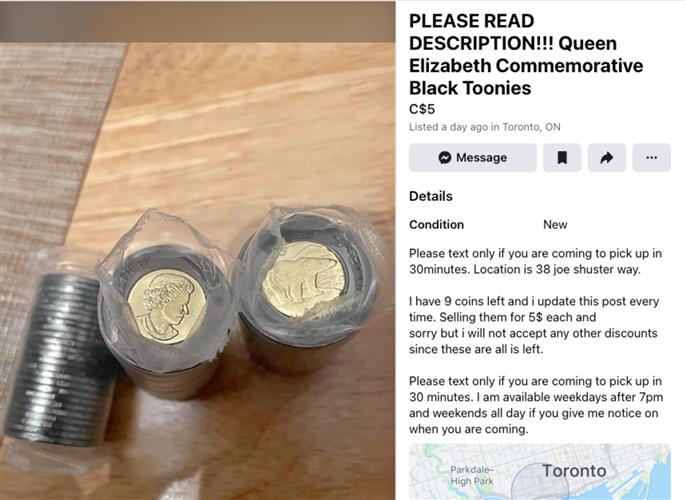 在脸书市场(Facebook Marketplace)上有数十个贴子,以100至150元一卷的价格出售这种黑色硬币。也有以每枚5元的价格出售这种2元硬币。