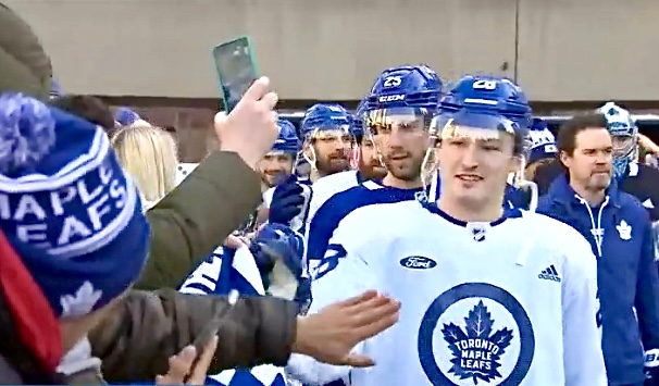 多伦多枫叶的球员被发现在星期日下午乘坐地铁前往球队在Nathan Phillips广场的年度室外训练。