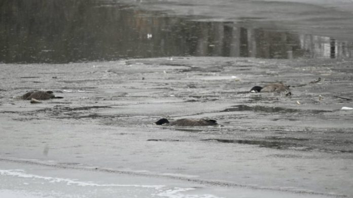 政府官员移走约六只死在冰面上的鹅,他们说这些鹅受到了禽流感的影响。Isabelle Wagner说:“这让人感到担忧,因为这附近有很多鸟类,我们有点措手不及。”