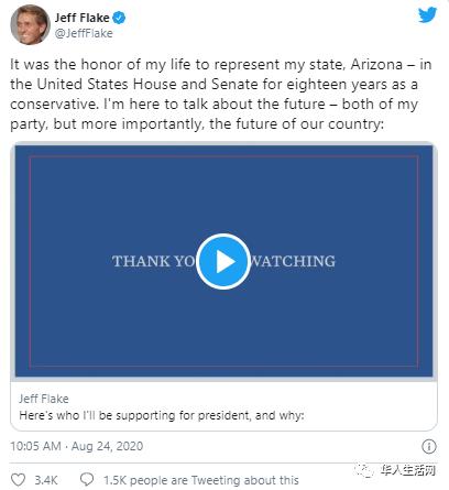 共和党全国大会(Republican National Convention)登场,拜登选举阵营则在24日上午证实,包括前任亚利桑纳州联邦参议员佛莱克(Jeff Flake)在内等20多位共和党籍前任国会议员,共同组成「共和党人挺拜登」(Republicans for Biden)组织,在今年总统大选当中选择与拜登站在一起。