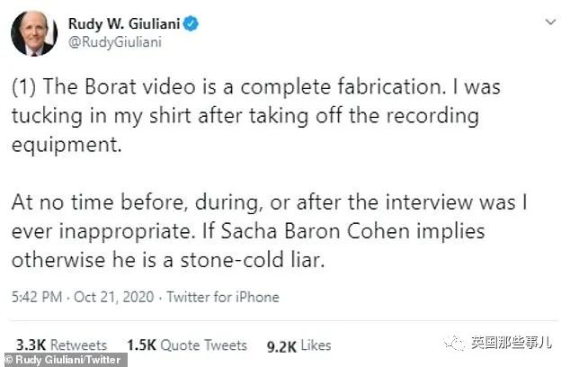 最近,《Borat》搞了一个恶搞续集。就是在这个续集中,他们摆了朱利安尼一道。片子里,波拉特的女儿Tutar假装成保守派记者约朱利安尼采访。也不知道为啥,朱利安尼居然同意了…