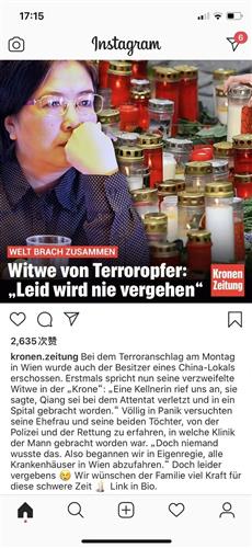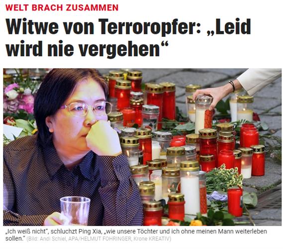 上周末,陈志彬遗孀夏萍接受奥地利媒体《皇冠报》采访时,讲述了自己对丈夫突然离世的震惊和悲伤。恐袭发生当时,陈志彬在位于维也纳内城Rabensteig自己的餐馆里听到枪声后想去锁上人口出,就在这时恐怖分子朝他开了枪……