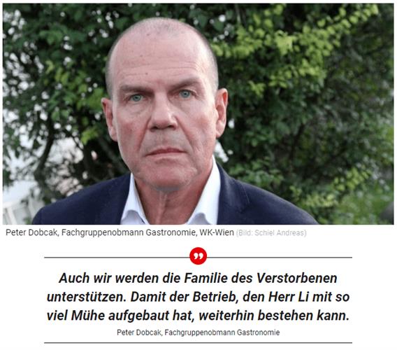 奥地利联邦商会维也纳餐饮理事会主席皮特·多巴查表示,他们也将帮助死者家属,让陈志彬兢兢业业打拼起来的事业得以为继。奥地利联邦商会维也纳餐饮理事会主席皮特·多巴查在上周悼念陈志彬活动中讲话,维也纳商会中餐业代表提姆·乌尔邦(Tim Urban)在悼念活动中讲话,此外,为了在精神和物质上对陈志彬家人予以帮助,奥地利浙江商会开设了捐款帐户: