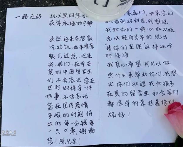 在悼念活动中,奥地利侨界代表、陈志彬生前友人也纷纷向《欧洲时报》讲述了陈志彬和家人在奥地利的艰辛创业历程:奥地利华人餐饮服务联合总会会长 赵小凤:中国驻奥地利大使馆科教文处领导也希望通过奥地利侨界治丧委员会对陈志彬的不幸遇难表示沉痛哀悼,对其家属表示深切的慰问。