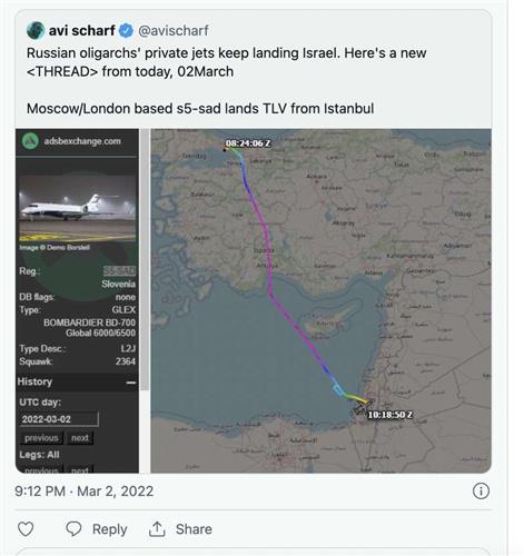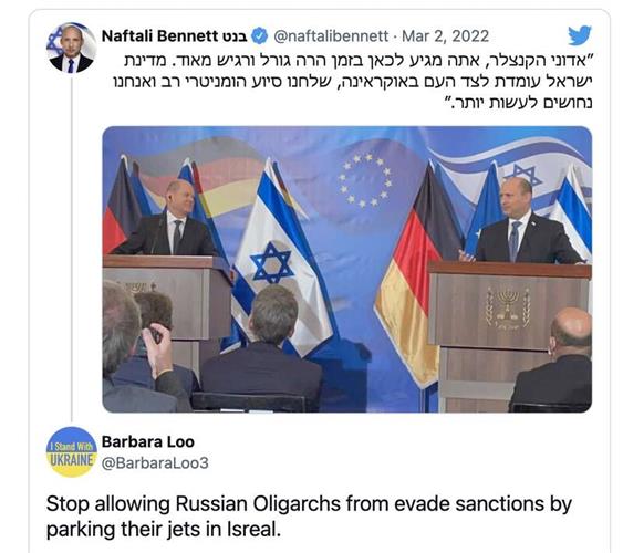 以色列“第12频道”(Channel 12)报导,过去10天内,有14架从俄罗斯起飞的私人飞机于以色列降落,数量之多显然异常,可能代表部分俄国寡头为躲避西方制裁,紧急飞往未加入制裁行列的以色列。美国国务次卿卢岚(Victoria Nuland)已警告以色列“不要接受俄罗斯的脏钱”,呼吁其加入制裁;《以色列时报》(The Times of Israel)报导,以色列已禁止这些私人飞机于该国地面停留超过48小时,但仍未宣布加入制裁。
