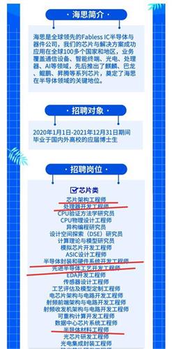 日前记者最新华为海思招聘公众号获悉,华为海思已启动2021届博士招聘,面向2020年1月1日-2021年12月31日期间毕业于国内外高校的应届博士生,工作地点包括北京、上海、深圳、东莞、武汉、西安、成都、杭州、南京、苏州等国内主要城市。