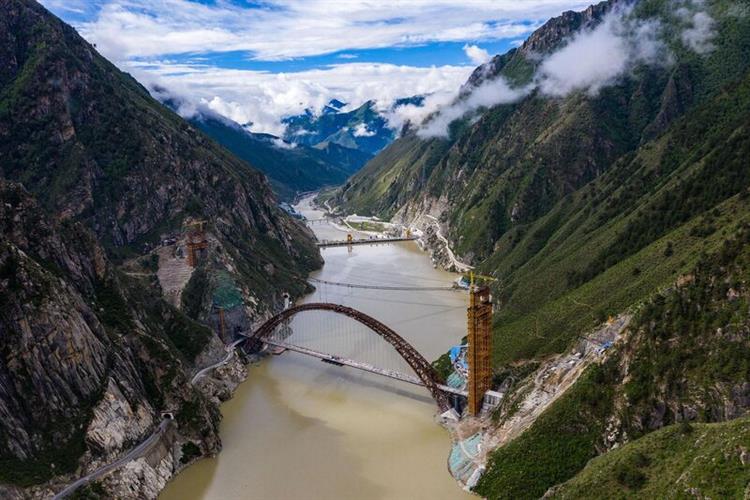 2020年6月20日,位于西藏自治区加查县的藏木特大桥成功合龙。藏木特大桥位于藏木水电站上游库区,横跨雅鲁藏布江。大桥全长525.1米,主拱跨径430米,桥址处海拔3,350米,是目前世界海拔最高、跨度最大的铁路钢管混凝土拱桥。(中新社)