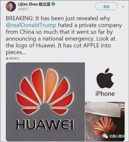 华为的困境,有目共睹。去年,他在推特上,发布了一张“苹果切片照”。“突发新闻:特朗普这么痛恨中国民企的原因揭晓了,看看华为的标识,它把苹果切成了碎片……”