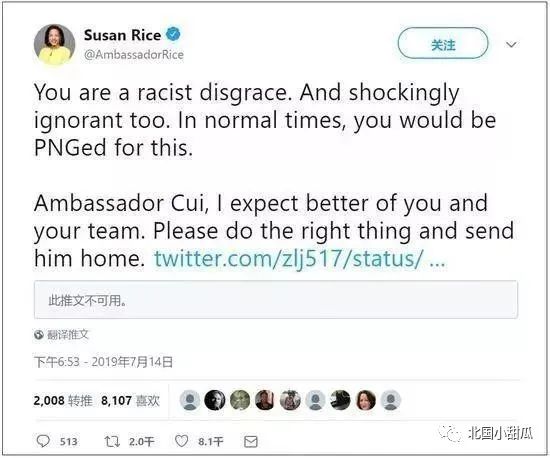 此文引发美前驻联合国大使苏珊⋅赖斯激烈回应:她大骂赵立坚:“你是个可耻的种族主义者,而且惊人的无知”。
