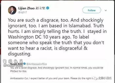 “我目前常驻巴基斯坦首都伊斯兰堡,并不属于中国驻美大使馆。你赖斯将自己不认同的言论诋毁为‘种族歧视’好可耻、好恶心。”