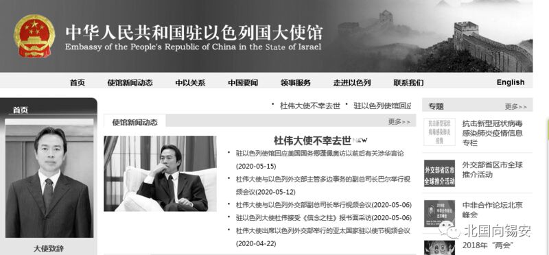 今年5月17日,特拉维夫传来噩耗,中国驻以色列大使杜伟猝然离世,年仅57岁。为祖国,他战斗到了最后一刻。